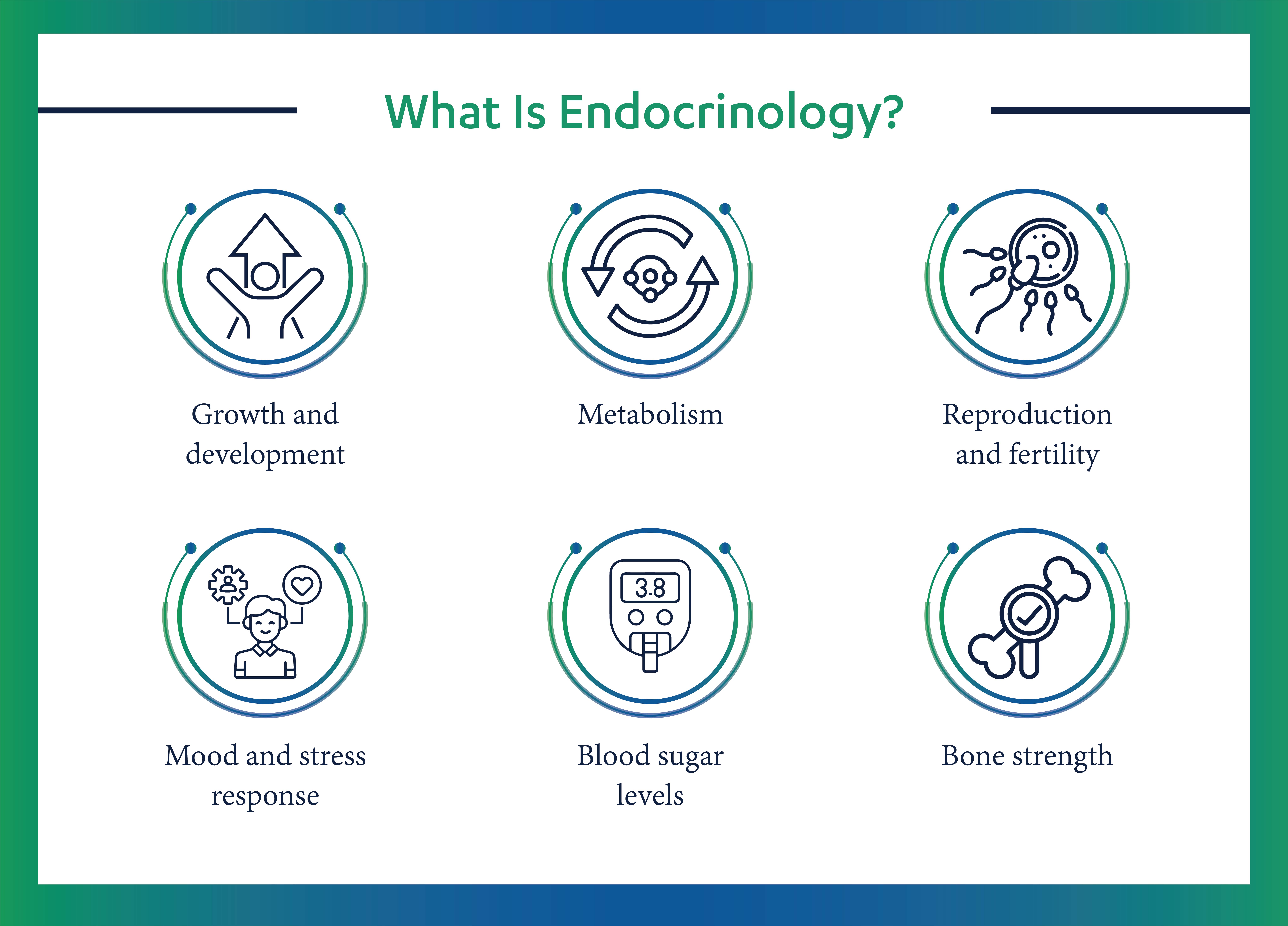 Endocrinology is a medical branch that deals with hormones the chemical messengers in our body. These hormones are produced by glands such as the thyroid, pituitary, pancreas, ovaries, and adrenal glands. They travel through the bloodstream and control many body processes like